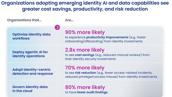 • Organizations that adopt advanced AI and identity data capabilities see significantly higher cost savings, productivity, and risk reduction